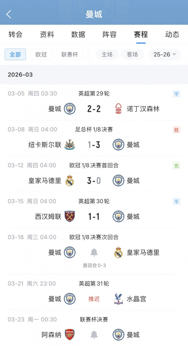 进入3月份各项赛事逐渐进入冲刺阶段,曼城近4场只收获1胜,为足总杯1/8决赛3-1击败纽卡。其他三场分别2-2平诺丁汉森林、0-3不敌皇马、1-1平西汉姆。